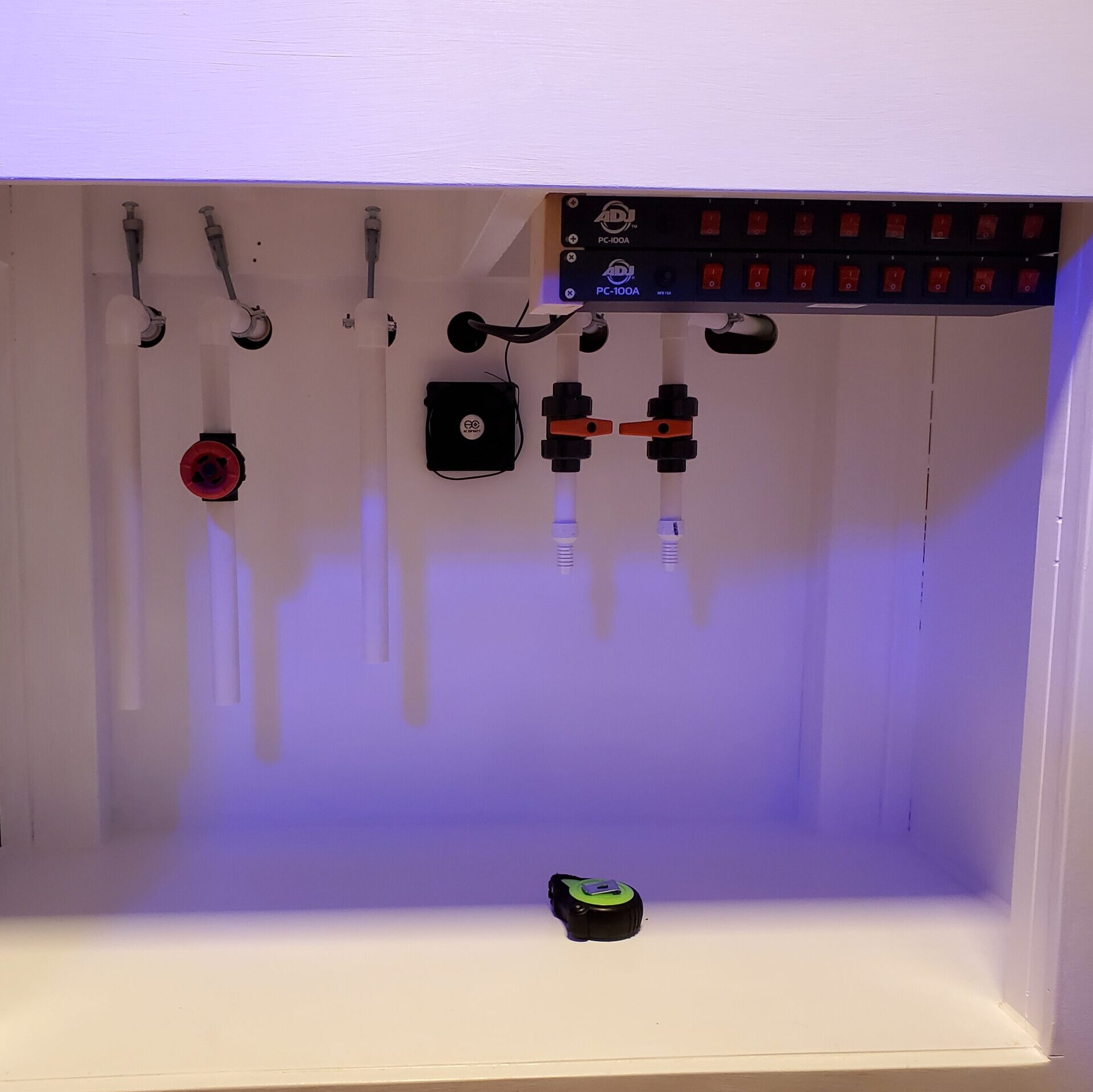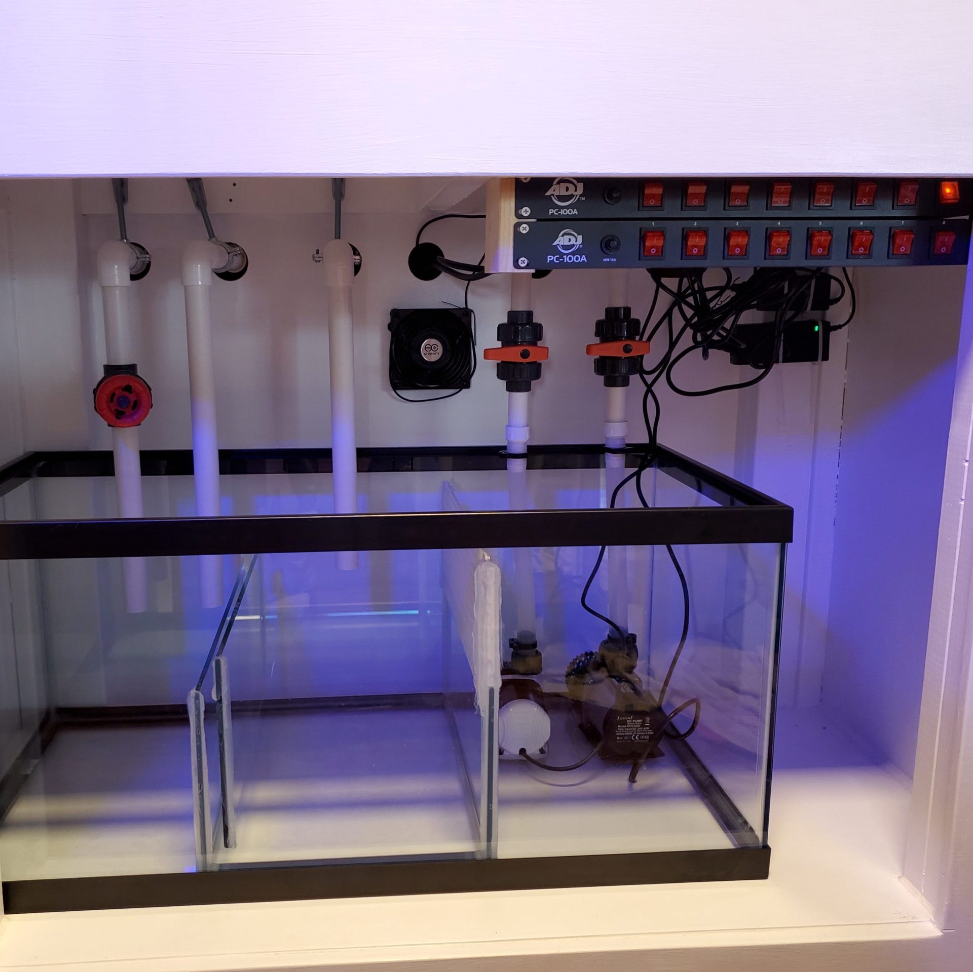 Rigid plumbing with galvanized brace hardware for a 150 gallon tank with Bean Animal overflow and dual returns. Gate valve on overflow for a silent continuous siphon. Ball valves on returns for regular maintenance of return pumps. Dual power strips and ventilation fan for cabinet. Basic 3 chamber sump design.