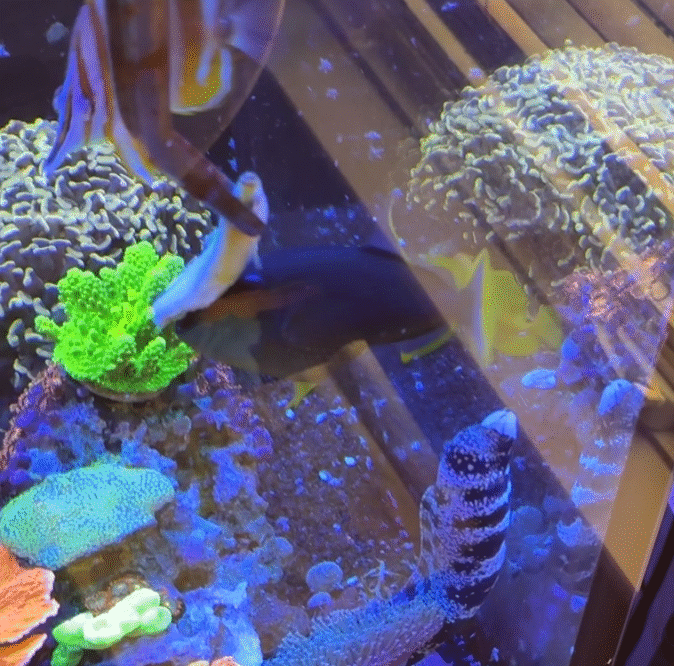 Maxima clam, squamosa clam, rose bubble tip anemone, bubble coral, torch coral, gold hammer coral, blastomussa, rock flower anemome, montipora capricornis, acropora, montipora spongoda, zoanthids, mushrooms, candycane coral, blue jaw triggerfish, copperband butterfly fish, clarkii clownfish, red hawkfish, coral beauty angelfish, blue damselfish, longnose hawkfish, coral banded shrimp, yellow tang, snow flake eel